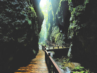 朝陽地縫一線天景區(qū)位于張家界慈利縣趙家埡水庫底部,是一個外河流入型的水底大溶洞,洞高30—80m,寬道5—25m,全長1550m,洞穴廊道呈峽谷狀態(tài),走向由南向北穿山而過,落差80余米,形成于高山峰叢喀斯特峽谷流域,深切河床滲漏石灰?guī)r斷層層里裂隙,向含水層集中循環(huán),再經(jīng)溶蝕、侵蝕崩塌作用,形成與原河道平行的地下通道,是喀斯特區(qū)過境河的伏流河。
